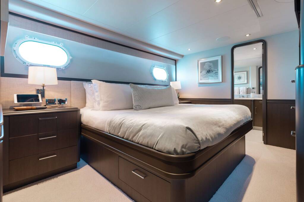 Accommodation: Master Stateroom - has center line California King bed, office on port side, Bench seat starboard side, separated toilets, with his/hers sinks. Waterfall shower, full hanging Closet and multiple storage drawers.