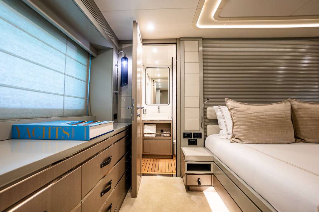 Accommodation: The Queen Primary Stateroom offers a spacious retreat with a comfortable queen bed, ensuite bathroom featuring a stylish waterfall shower, his and her heads, double closets, a dedicated TV, and a vanity area.