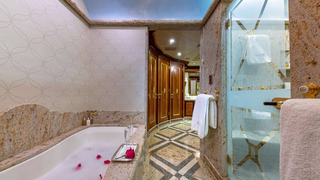 Accommodation: 185' STARSHIP has 4 King Staterooms and 2 Twin Staterooms. Her Master suite which is located on the Main Deck forward is full width of the beam and has a King-sized bed. This luxurious cabin has a seating area and desk and a 32" flat-screen TV with surround sound. The suite boasts a semi-circle His and Hers ensuite with separate wash closets and bidets linked by a Spa Pool tub and large shower stall. There is a VIP Cabin with a King bed on the Bridge deck offering 360 degrees views. Below deck, there are 2 VIP cabins with a King bed and ensuite and 2 large Twin cabins with a seating area. The 2 Twin cabins each come outfitted with 2 Queens rather than single beds. Each Cabin has an ensuite, SAT TV and iPod Stations linked to a surround sound system. Movies and music on demand. Creston control and remote systems including Creston Concierge- guests can order off a special menu direct from their cabin 24/7.