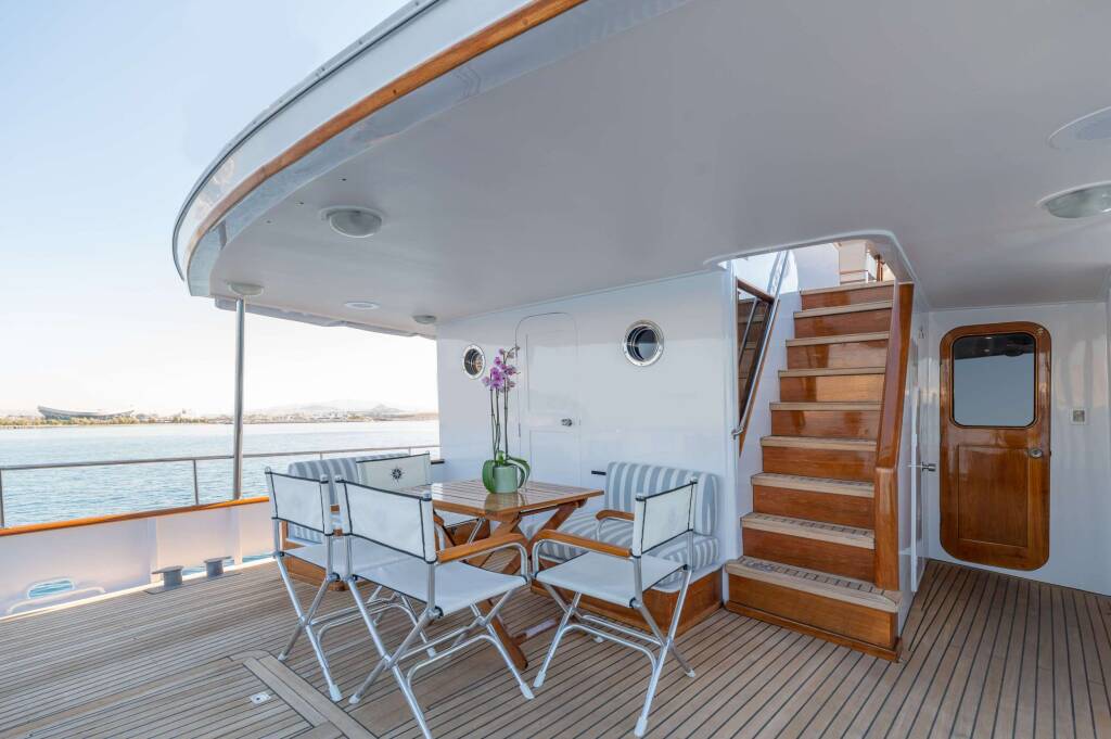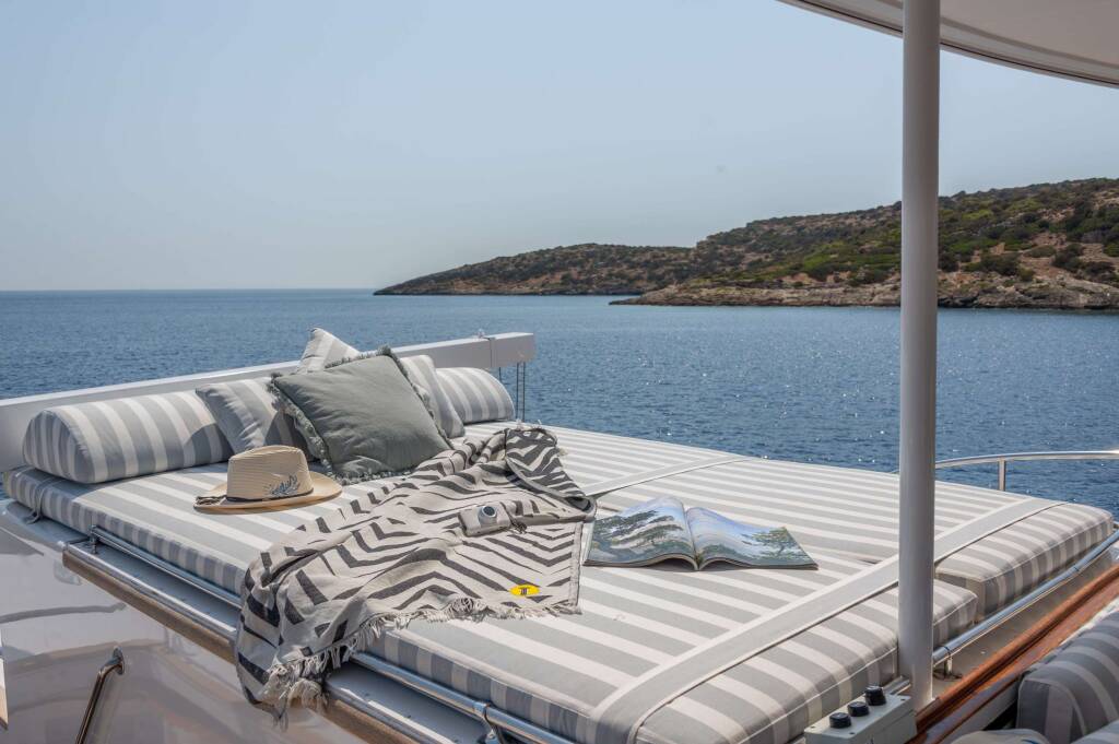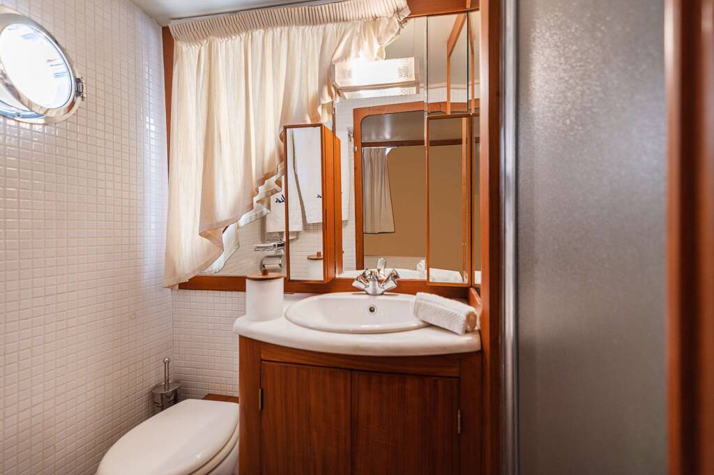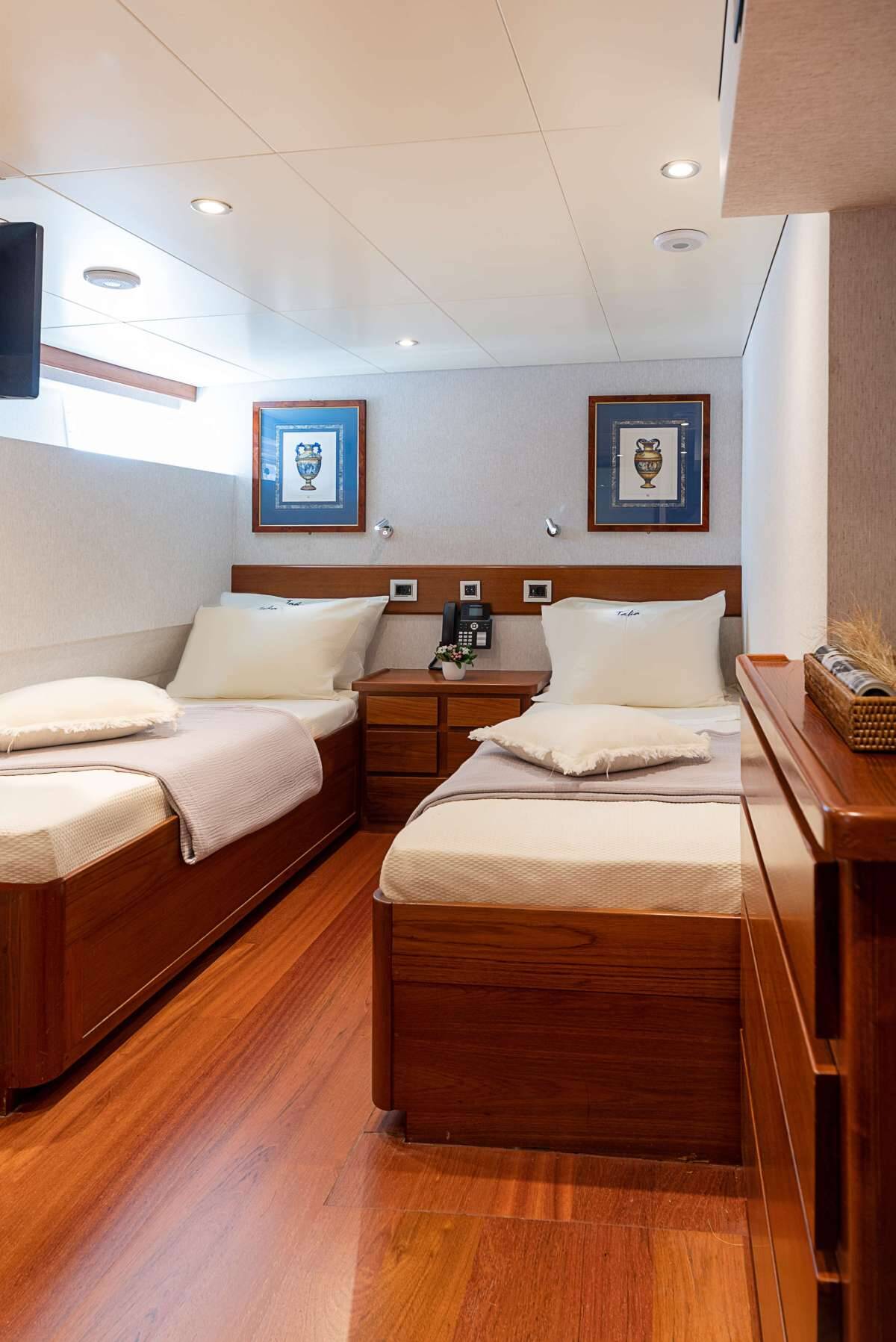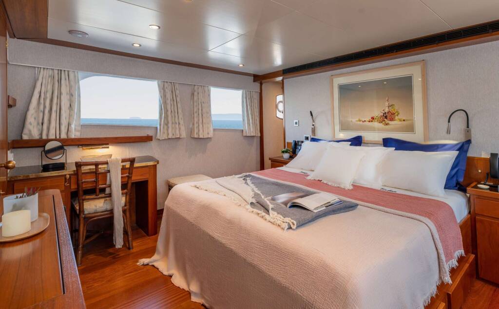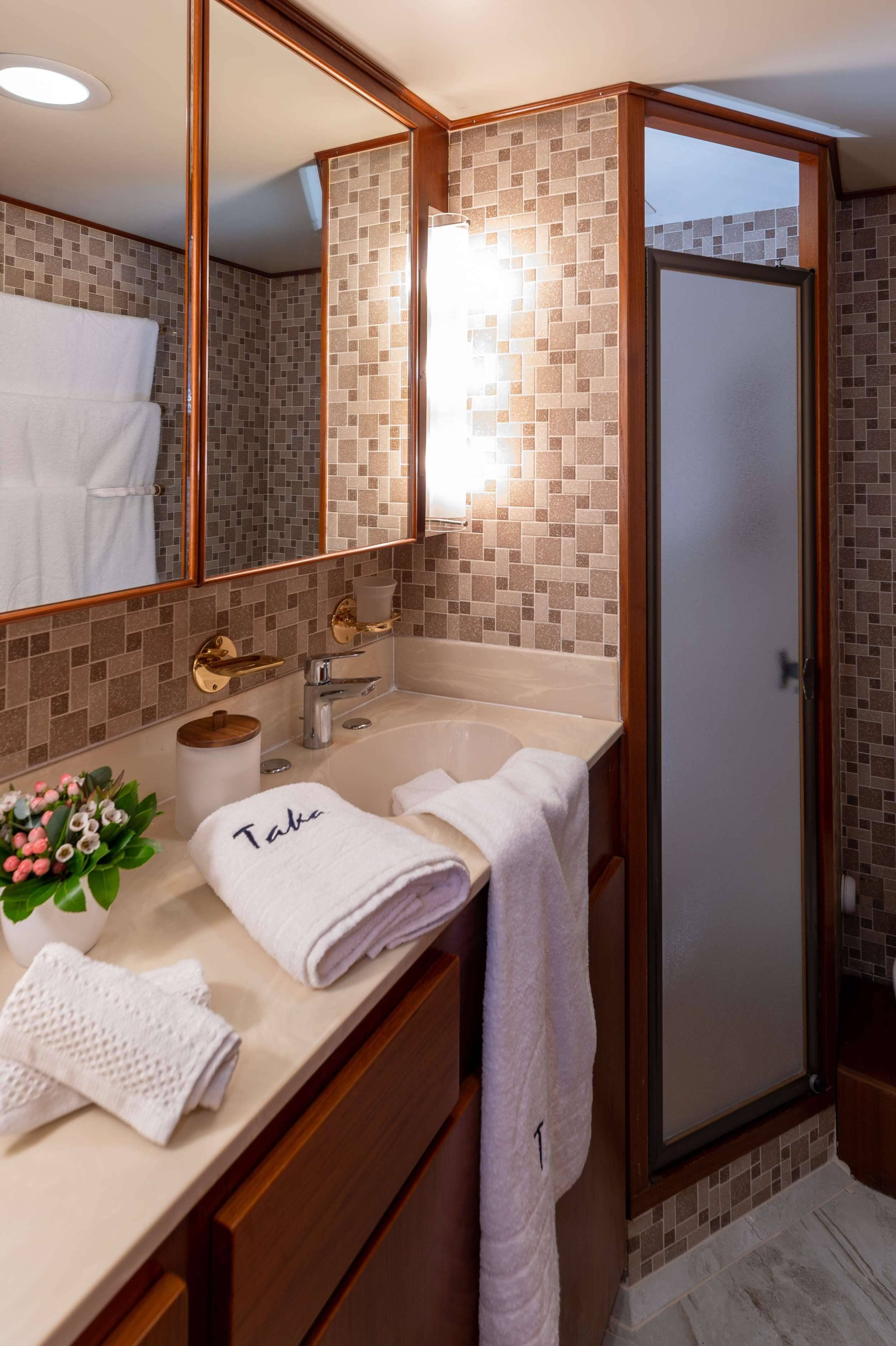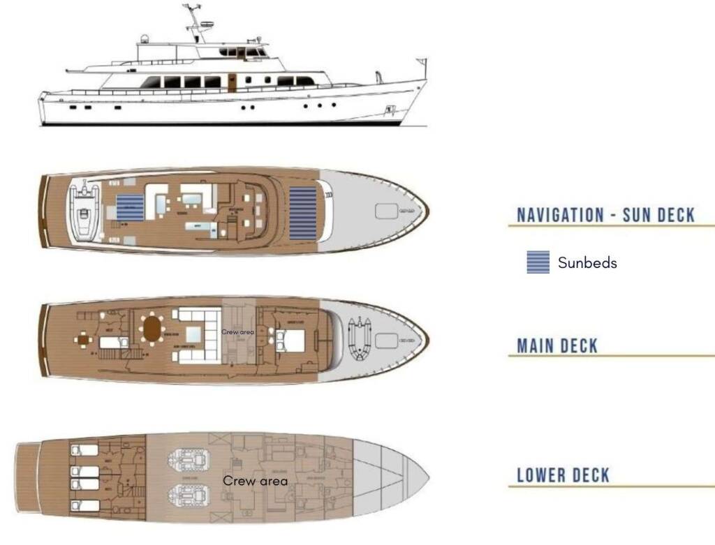 Accommodation: m/y TAKA comfortably accommodates up to nine (9) guests in four well-appointed cabins. The main deck features a spacious Master Cabin and a Single Cabin, both with ensuite facilities, along with a day head that includes a shower and can serve as a secondary bathroom for the Master. The lower deck offers two Twin Cabins, each with a Pullman berth and private ensuite. Accessibility is a key highlight, with an extra-large gangway and a chair lift to the sundeck, making the yacht particularly well-suited for guests with reduced mobility. For added convenience, there is also a day head on the sundeck (no shower).