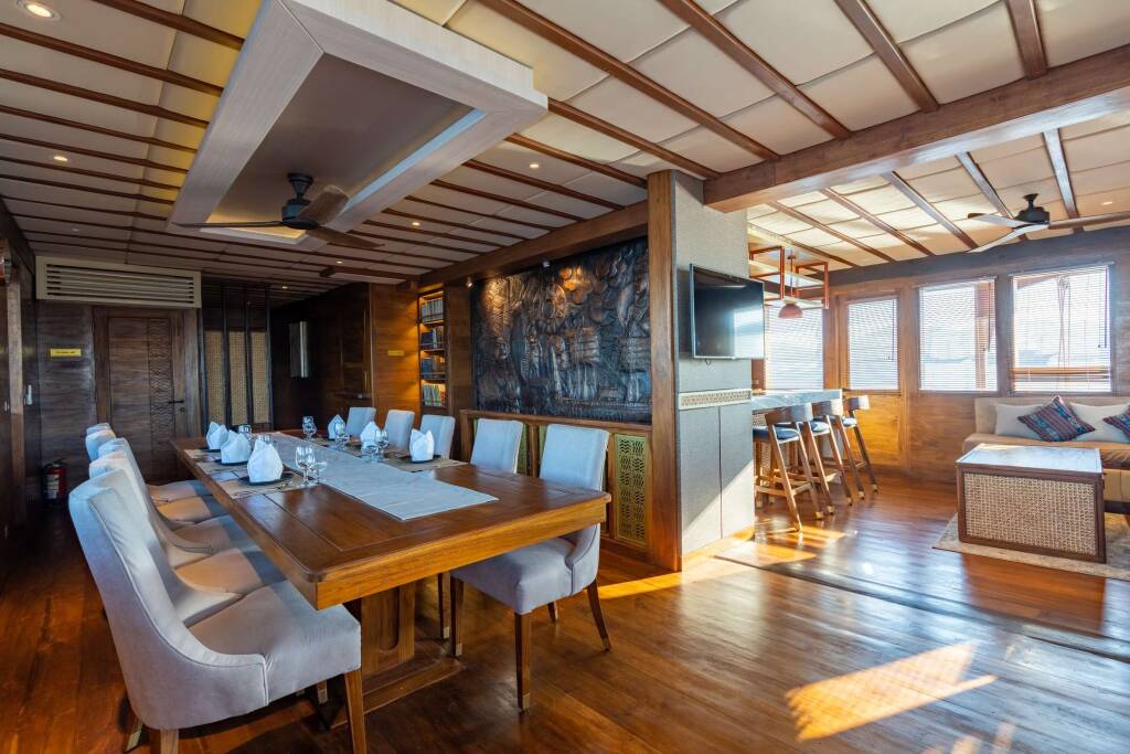 Admiral Suite is the largest master suite on a Phinisi cruise in the market. Being the only suite on the bridge deck, it offers full privacy, its own balcony, and a 270o view of the ocean. The ultimate ensuite has separate bathtub, rain shower, and Monsieur/Madame twin sinks.