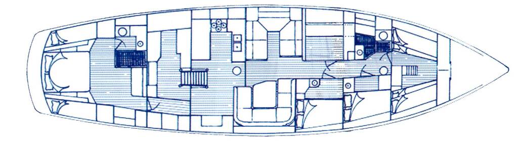 The two forward staterooms have double beds with vanities, hot and cold water sinks, and a vanity mirror. Both staterooms have closets and chests of drawers for clothing storage. The forward stateroom has a fold down writing desk. Each room has its own deck hatch and multiple opening porthole openings for fresh air. Both staterooms have their very own private head and shower.