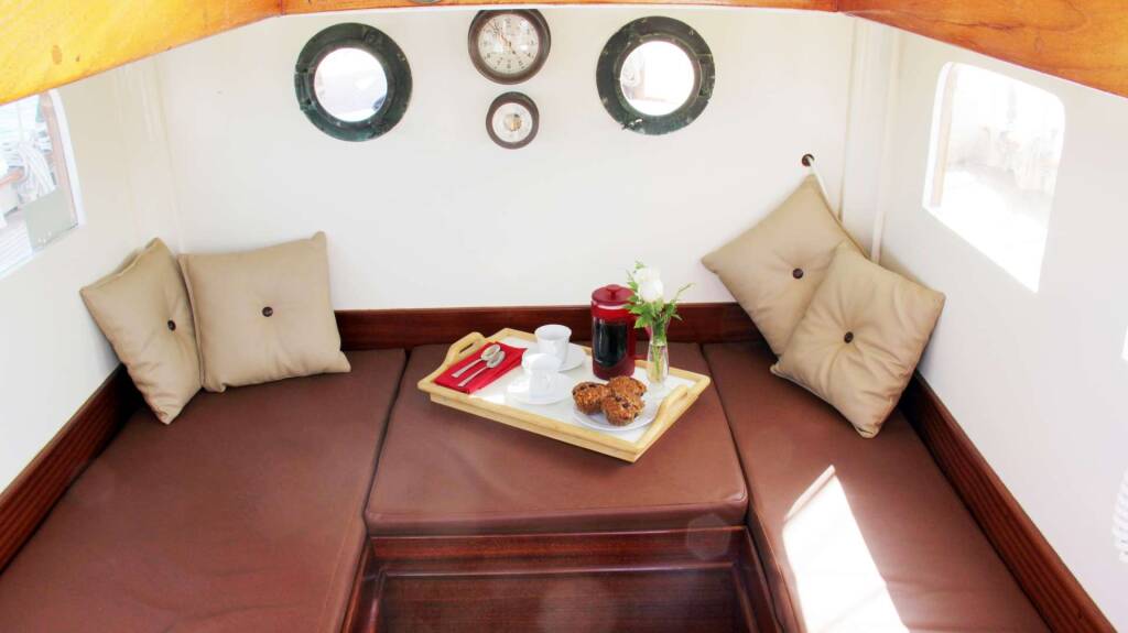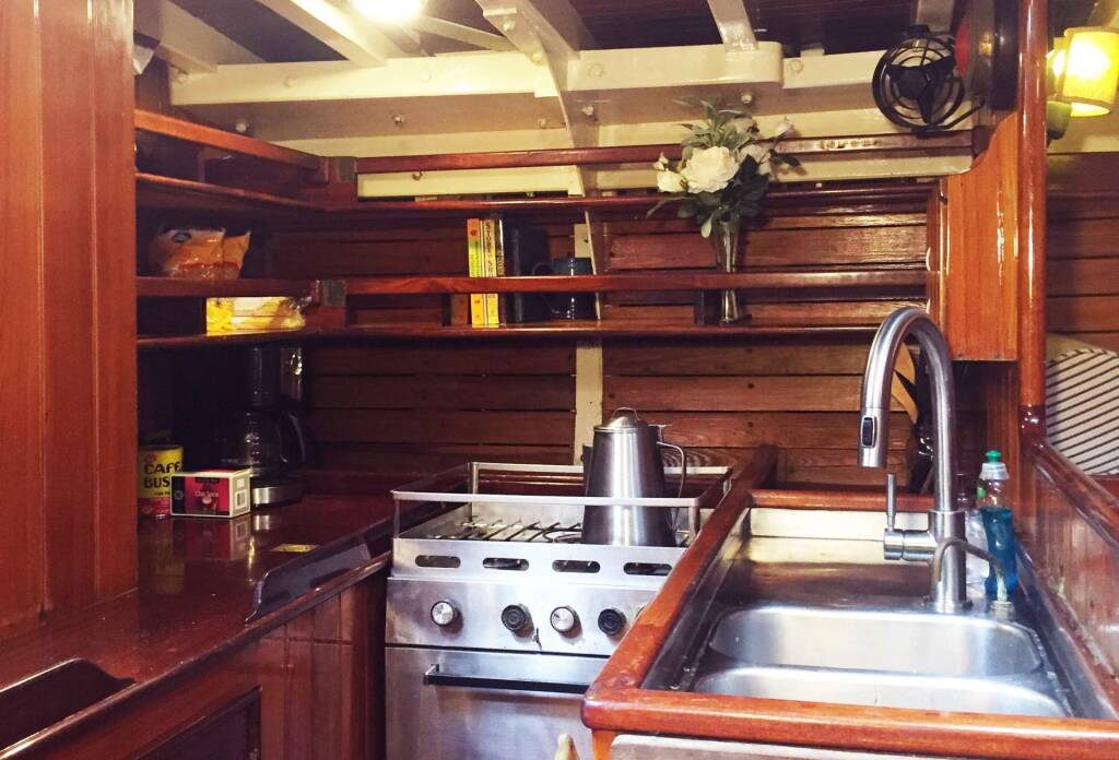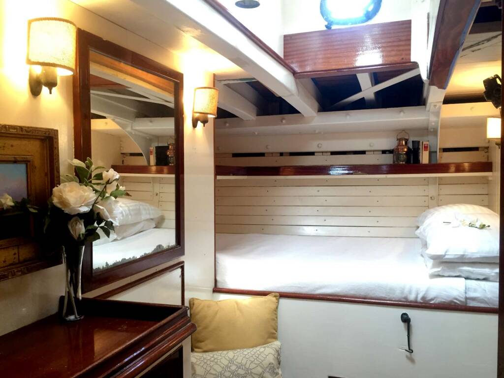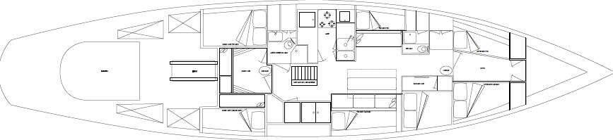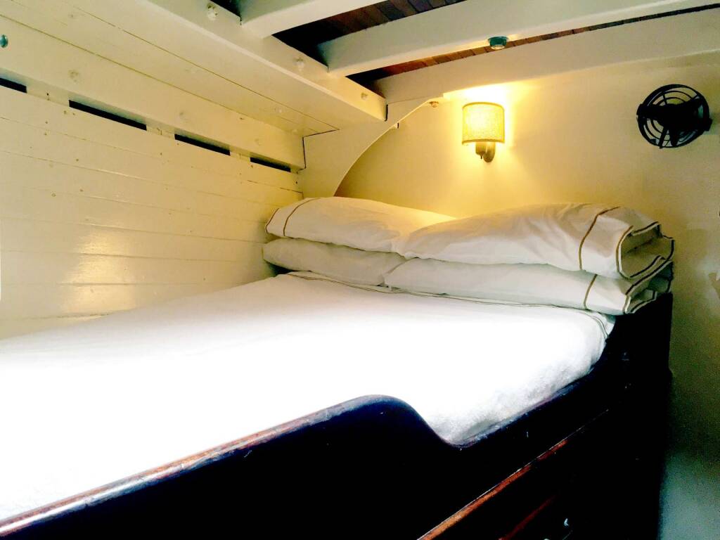Focsle: One wide-single and one single bunk, both with privacy curtains. Large overhead hatch makes a light, airy space