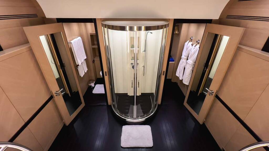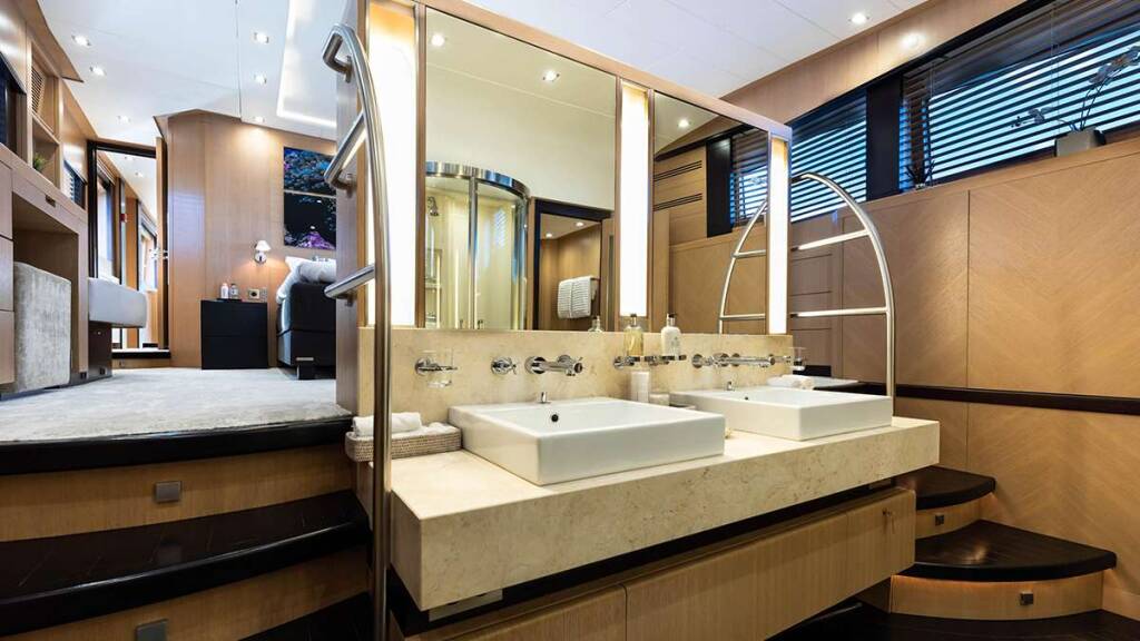 Master cabin: on main deck, sunken bathroom in the with two sinks, one shower, one separate and closed toilet, one
