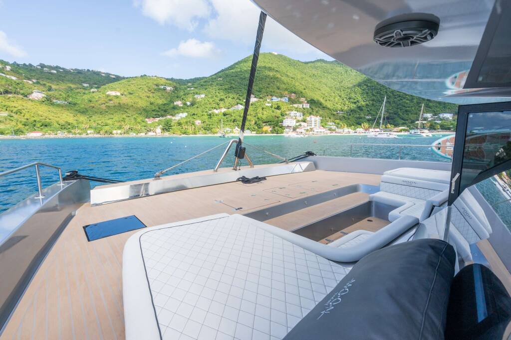 Aft Cockpit: A shaded outdoor lounge ideal for long, leisurely lunches, sunset cocktails, or watching the action in the water.