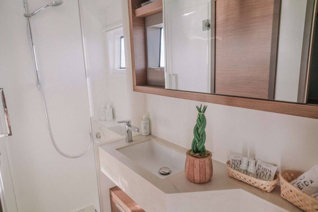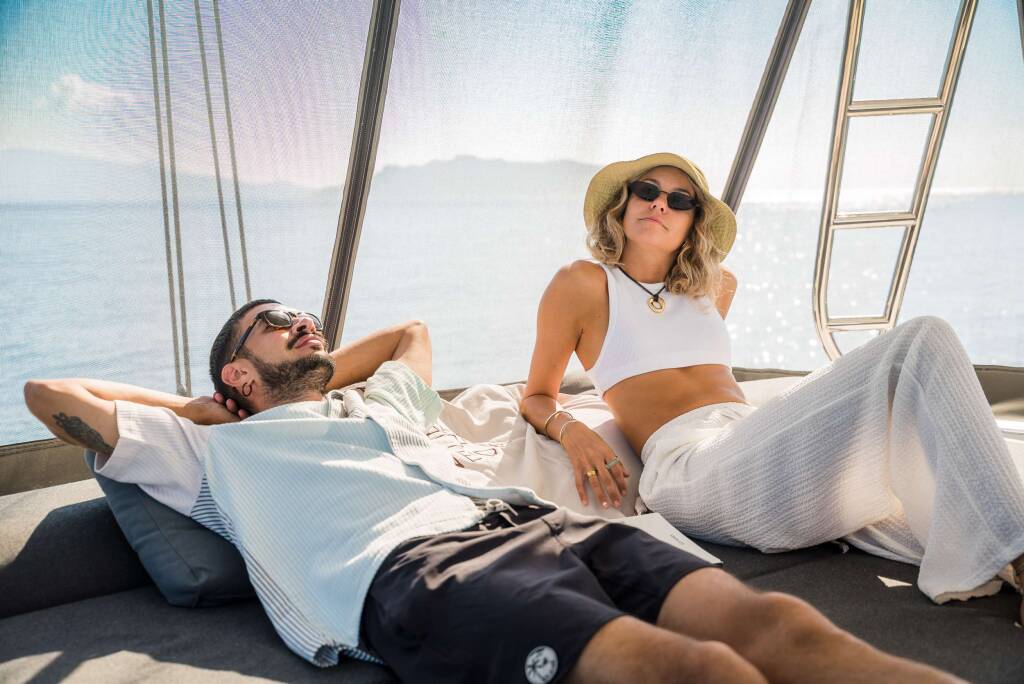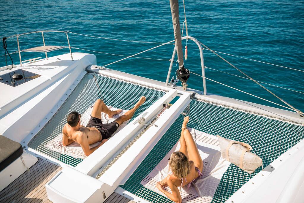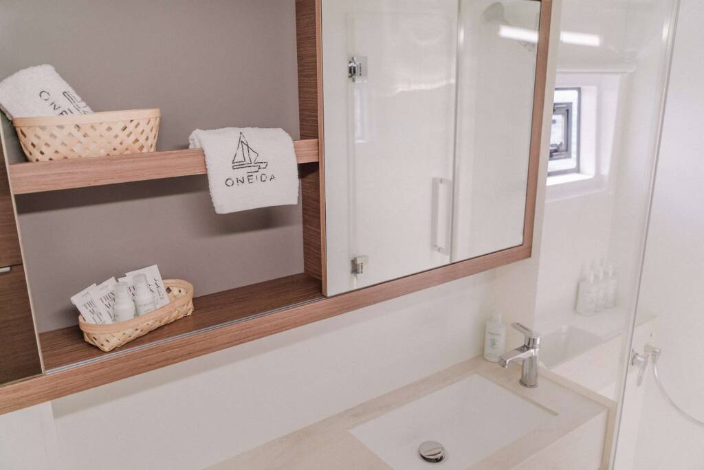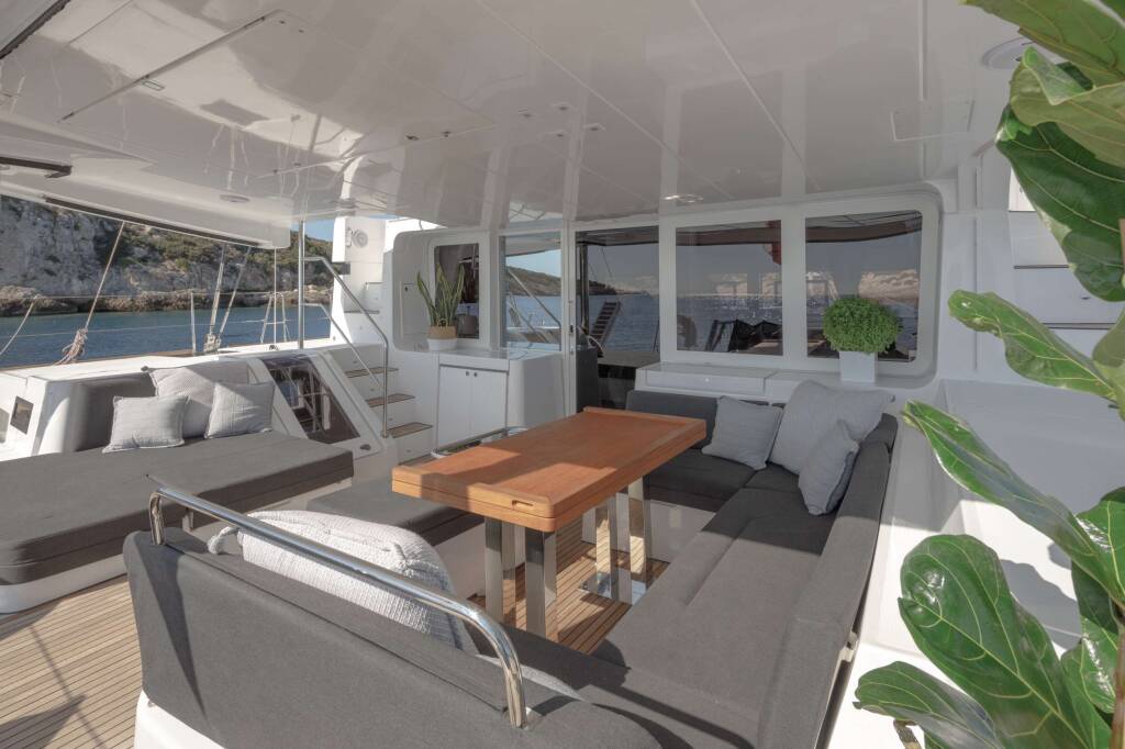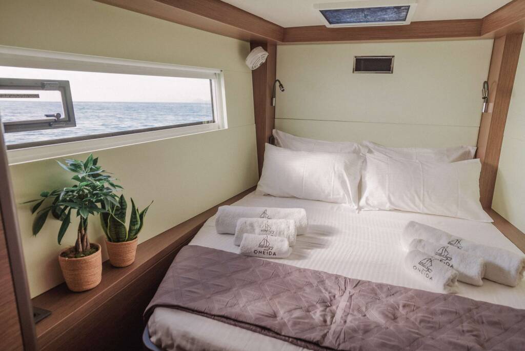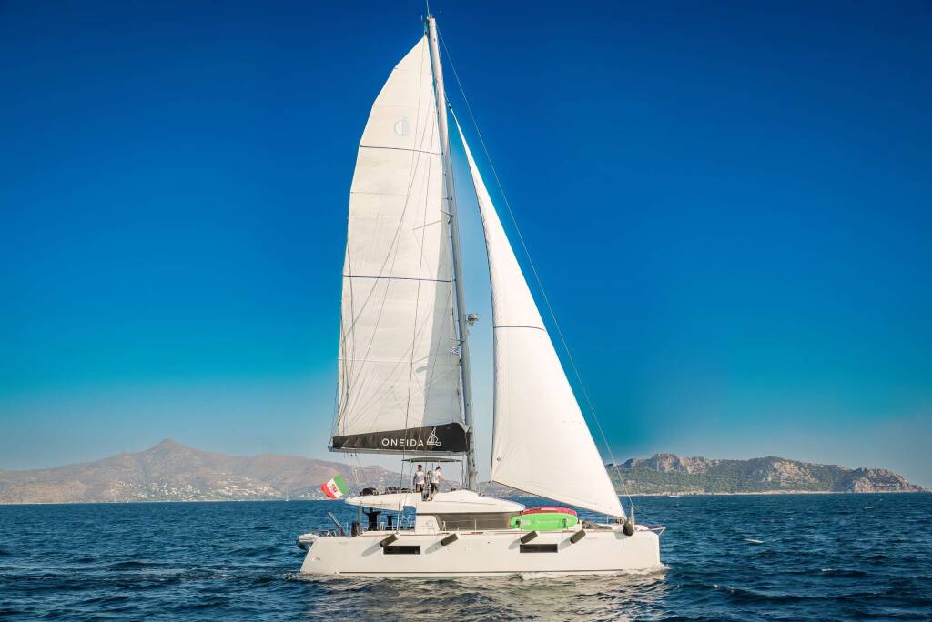Catamaran de luxe avec équipage ONEIDA, construit en 2020, est amarré en Greece. Il dispose de 5 cabines et peut accueillir 10 personnes.