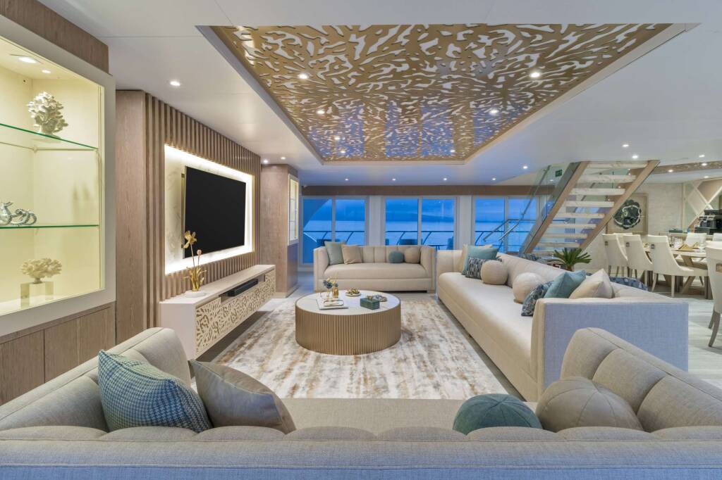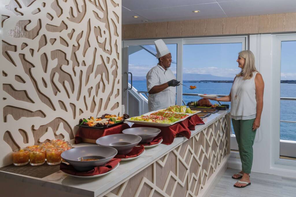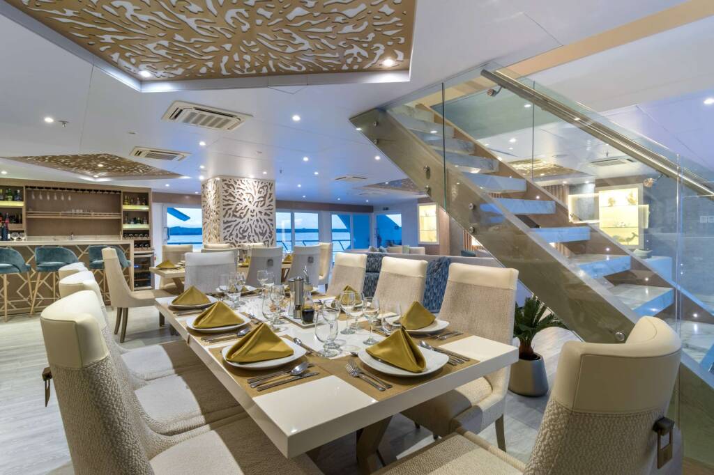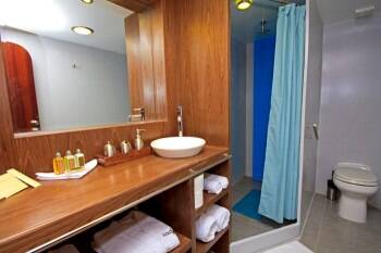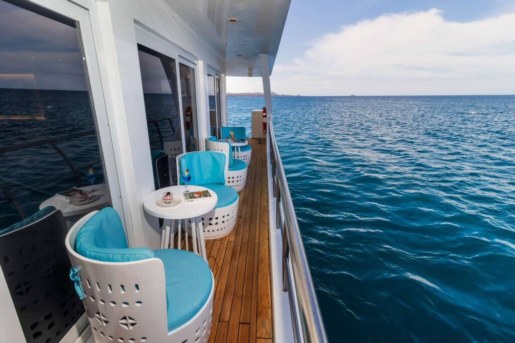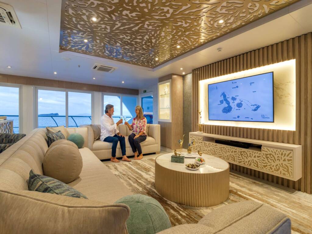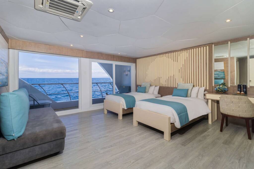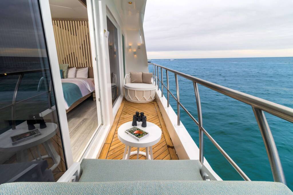 Accommodation: We offer our Golden Suites that make your stay on the Elite Catamaran truly special. These suites have large windows that give you amazing views of the ocean. You can choose to have one king-size bed or two twin beds, making it perfect for any traveler's needs. Our Golden Suites are designed with luxury and comfort in mind. They come with private balconies where you can enjoy fresh air and stunning sights of the Galápagos Islands right from your room. The rooms on our Elite Catamaran redefine the comfort and style standards. Every single room has a private balcony and serves as a sanctuary providing, through broad windows and private decks, breathtaking scenes of the Galapagos Islands. This option is perfect for those who seek an intimate experience with nature without giving up the comforts of a high-end hotel room at sea.