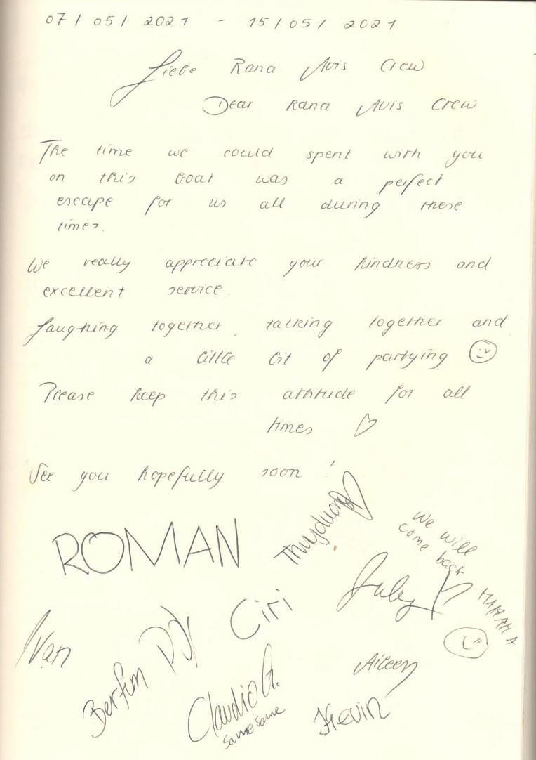 - APA (Advance Provisioning Allowance) : 35% des frais de location payé avec le solde pour couvrir les frais de fonctionnement pendant la location : Carburant environ. 3000 €/semaine (dépend de la consommation de carburant) est également facturé à partir de l’APA. frais de port et de marina, sports nautiques avec Sea Doo et annexe avec opérateur, entrées des parcs nationaux, frais de douane et licences d’affrètement si affrété en dehors de la Croatie, options de restauration et boissons, et tout ce dont les clients pourraient avoir besoin pendant l’affrètement. Un ensemble strict de comptes est tenu par le capitaine tout au long de la location et tous les fonds non dépensés sont remboursés au client dans leur intégralité.