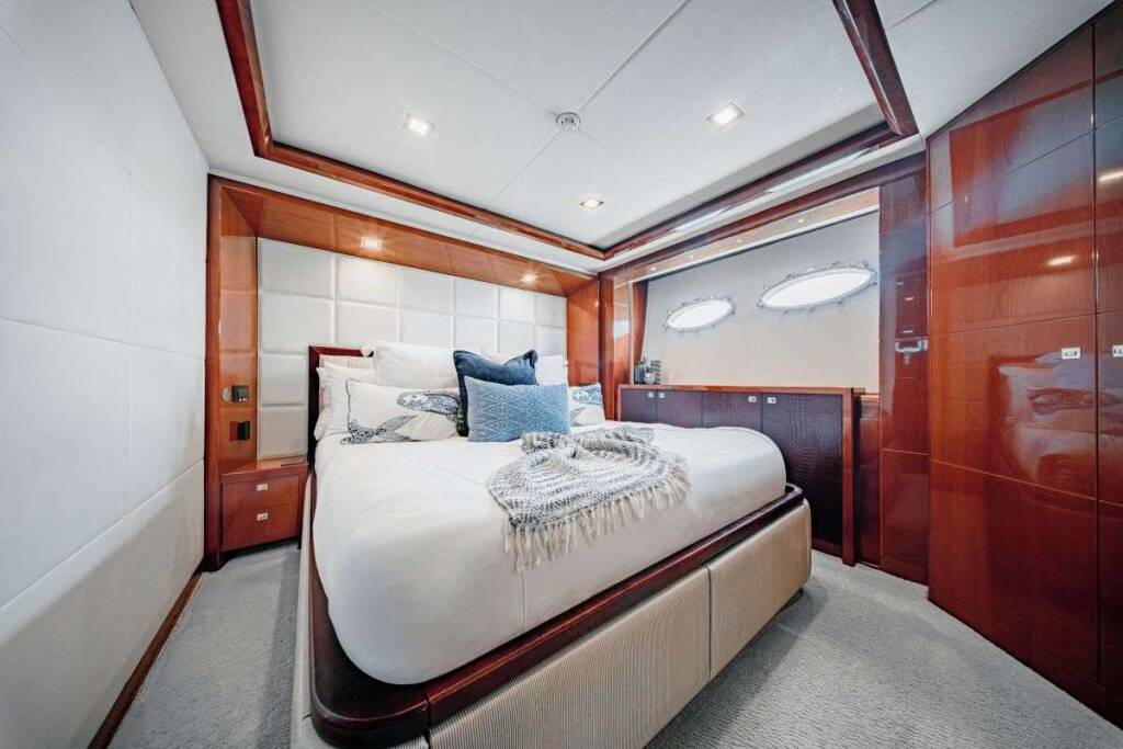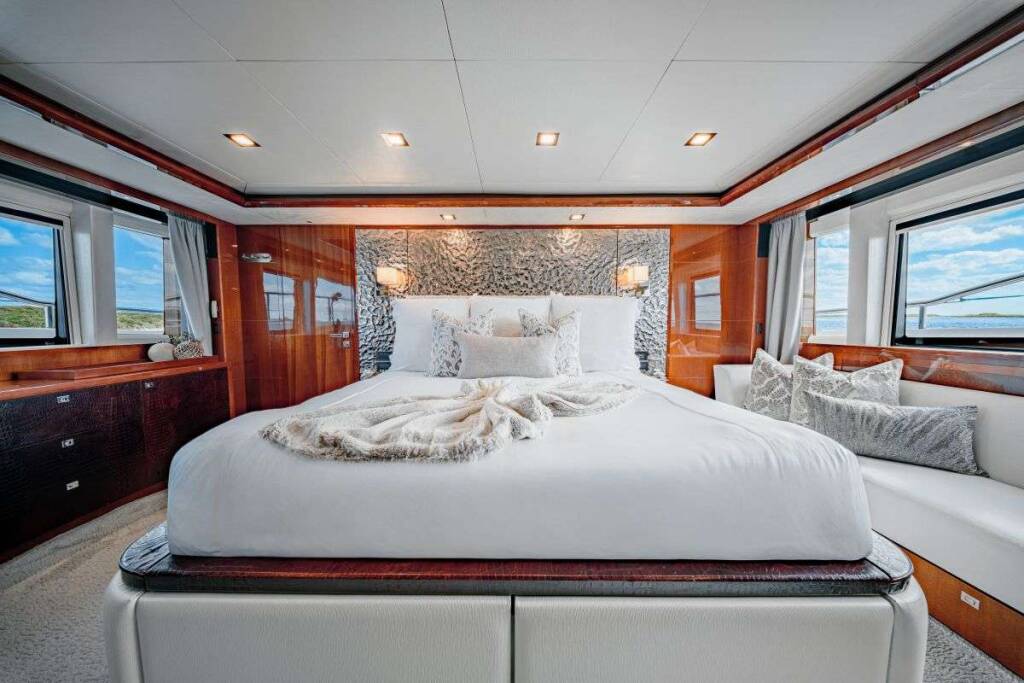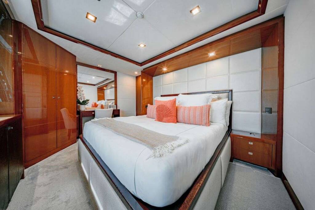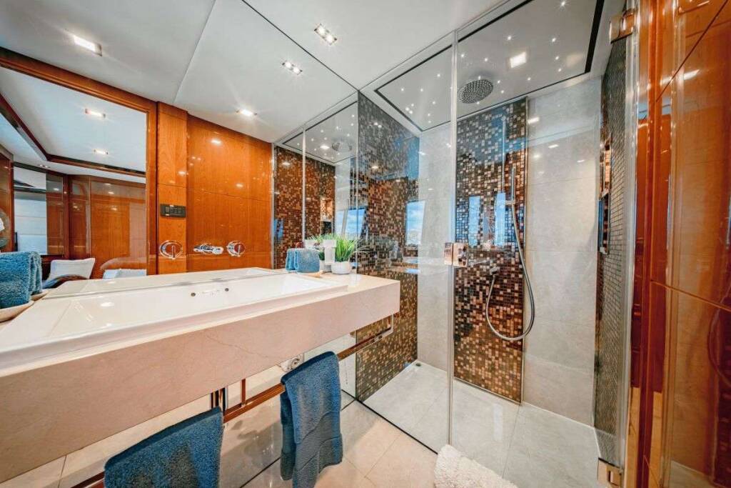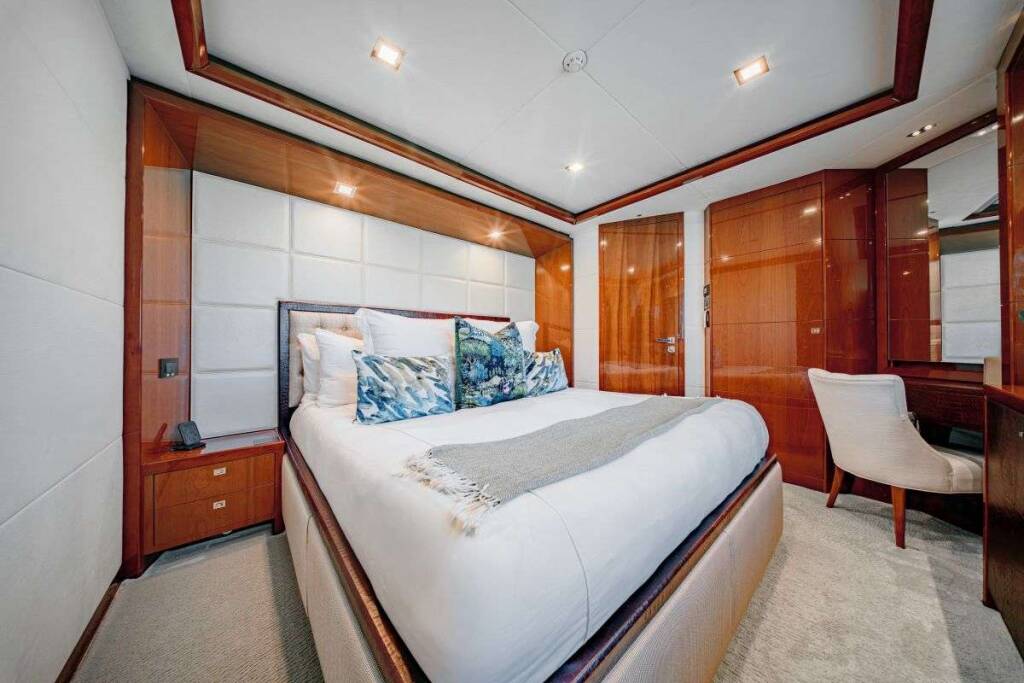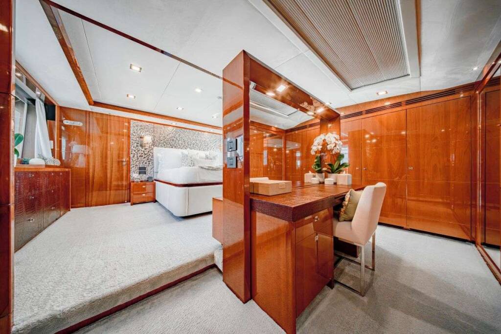 Occupying a prime position forward on the main deck, the full-beam master suite is a sanctuary of light and space. Expansive panoramic windows frame sweeping ocean views, while a king-size bed, vanity desk, and ample wardrobe storage ensure complete comfort. The en-suite bathroom is finished in marble, with dual sinks, a walk-in rain shower, and a separate bathtub, creating a serene retreat for the principal guests.
