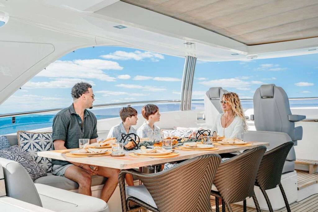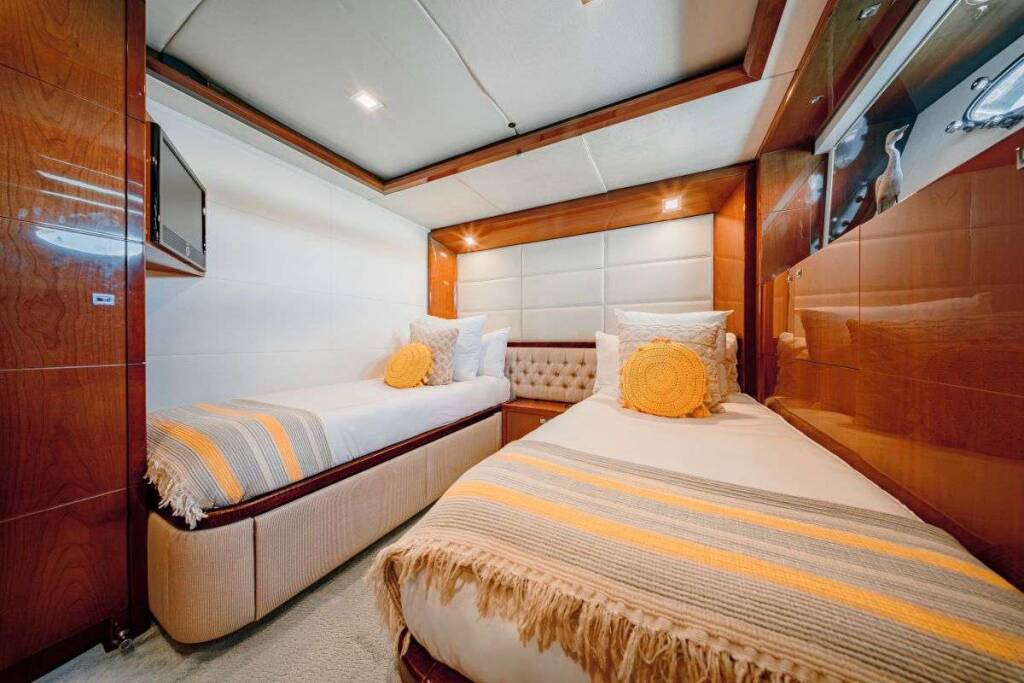 Forward on the lower deck, the twin cabin provides flexibility for families or friends, featuring two single berths, an entertainment system, and its own en-suite bathroom with a shower.