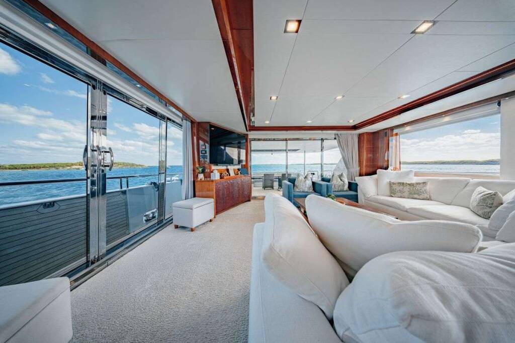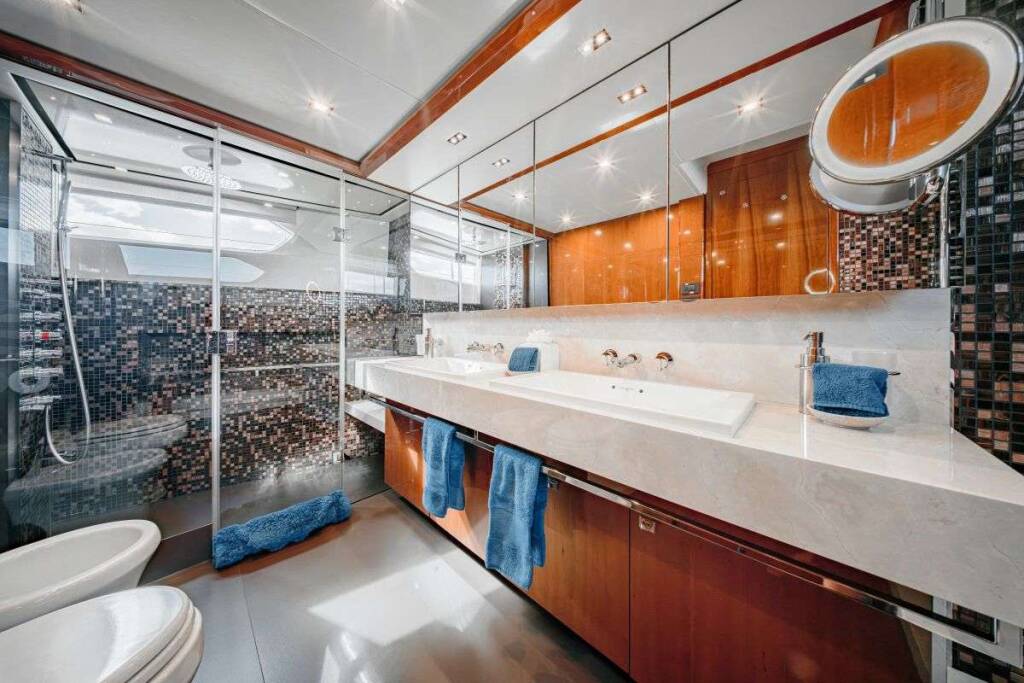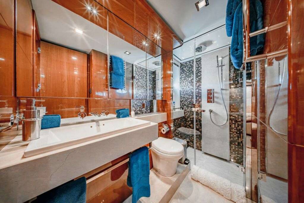 Amidships on the lower deck are two beautifully appointed double guest suites, each featuring a queen-size bed, refined cabinetry, and large hull windows that fill the space with natural light. Both cabins include en-suite bathrooms with glass-enclosed showers and elegant stone finishes, providing a luxurious and private escape for guests.