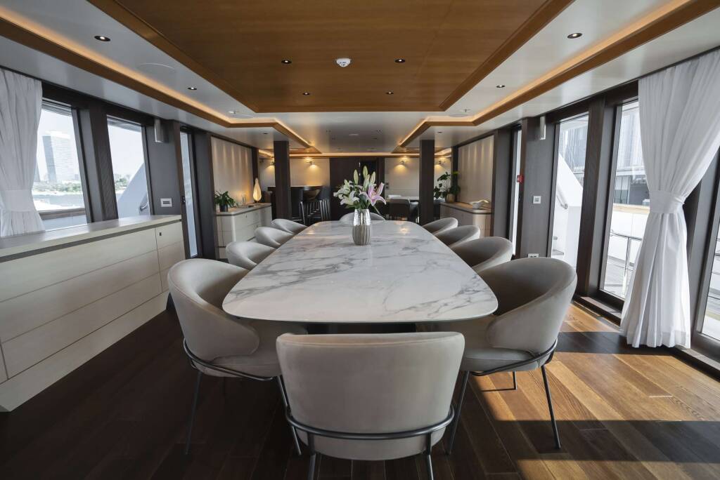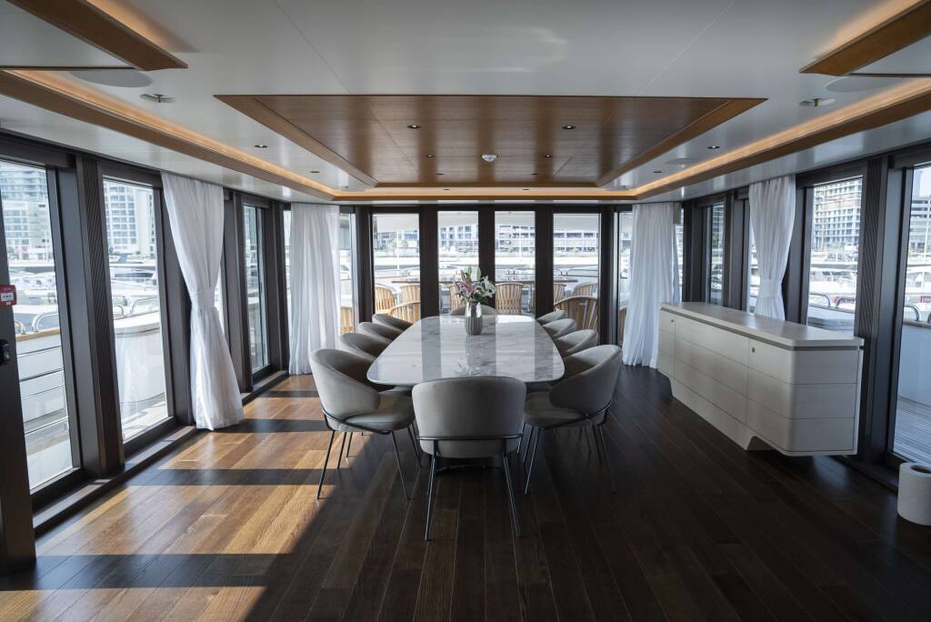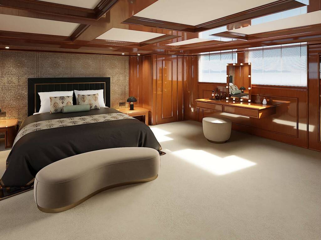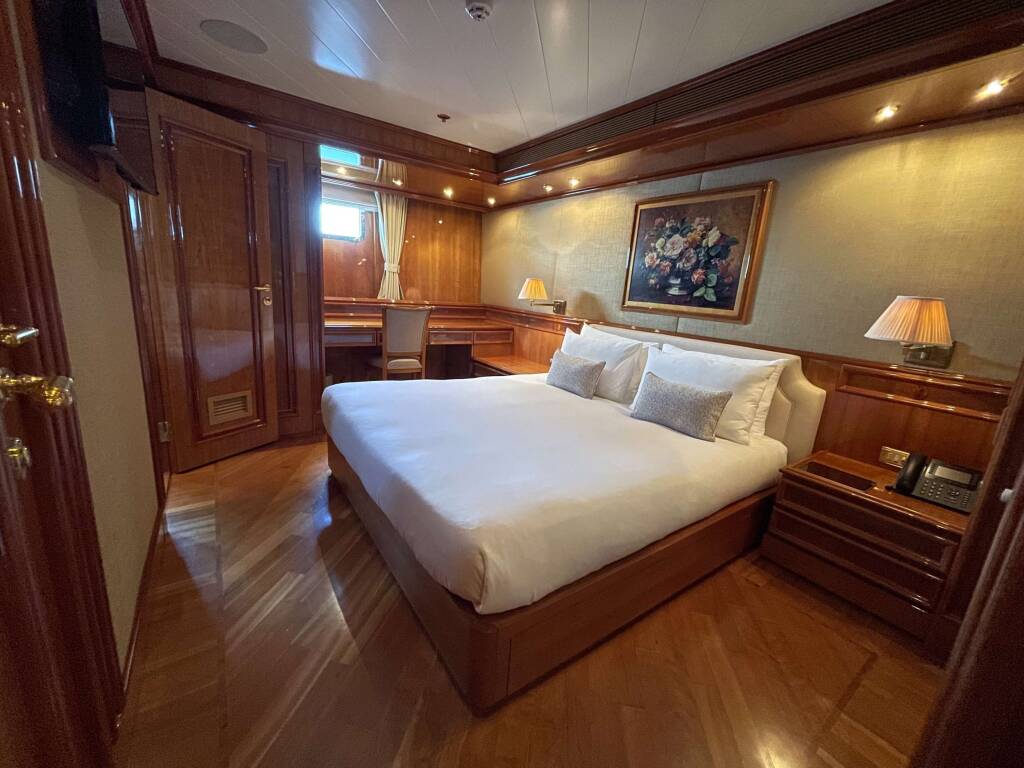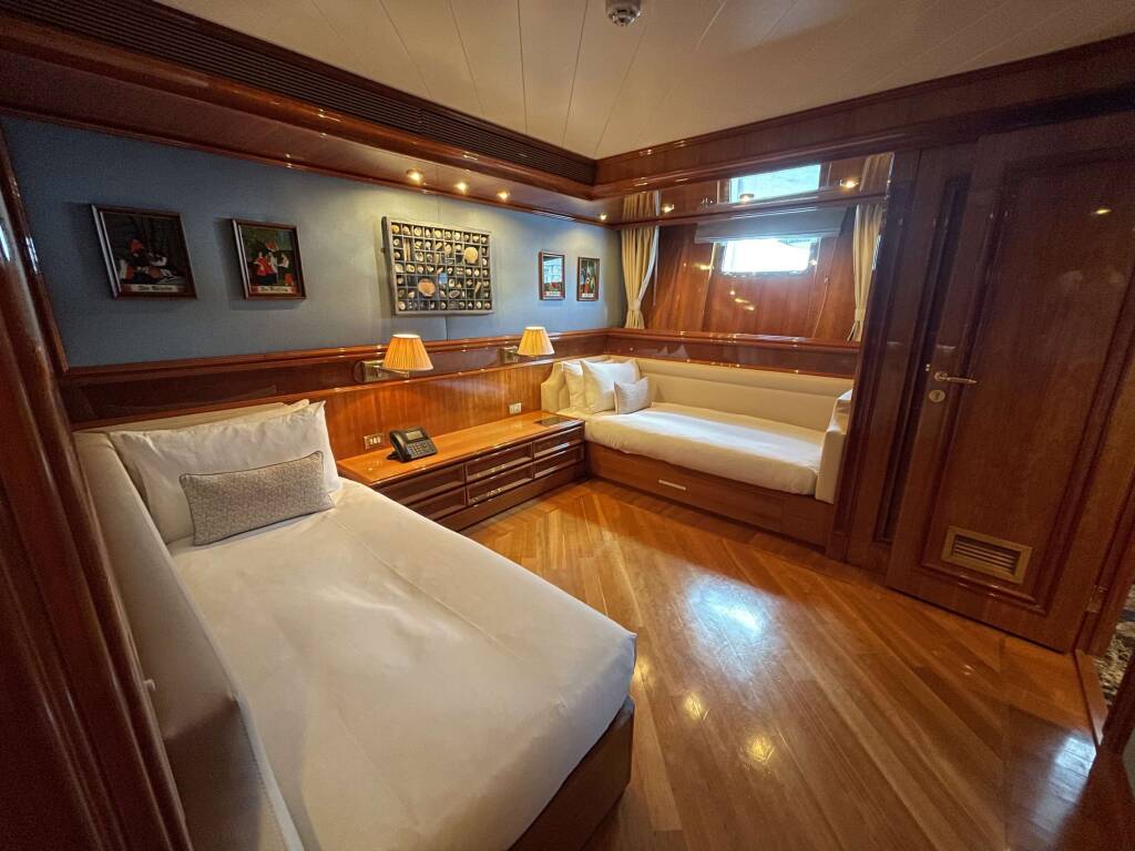 Accommodation: She boasts a full size Master Suite, including walk in dressing room and Office, plus His & Hers Bathrooms. One VIP Cabin is located on the Bridge Deck, with four cabins below, 2 x Double and 2 x Twin (with one Pullman in each of the Twins)