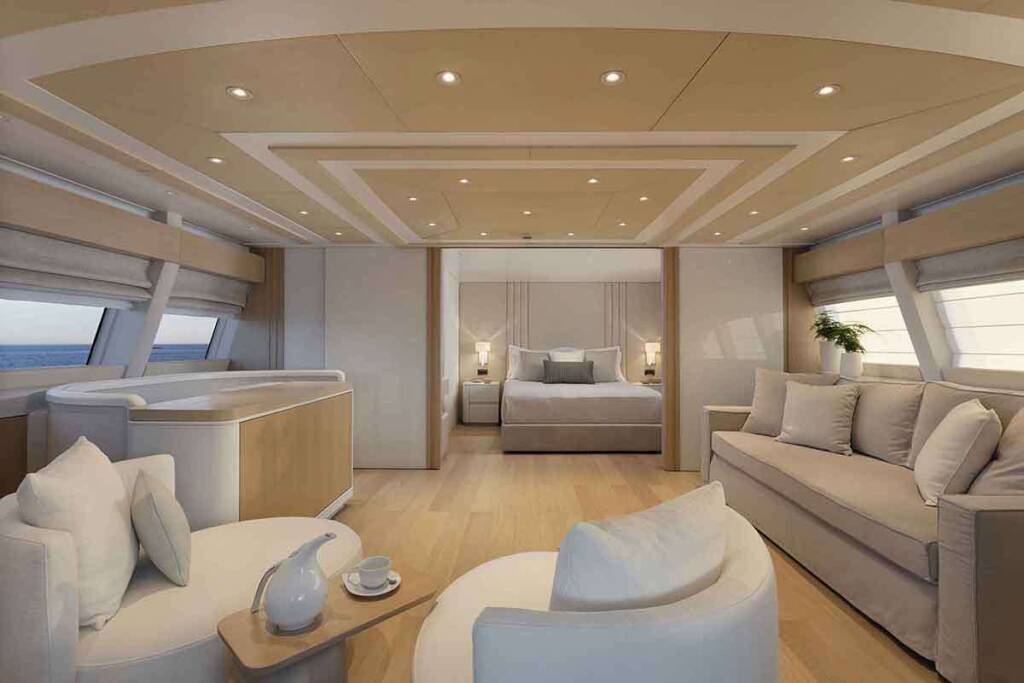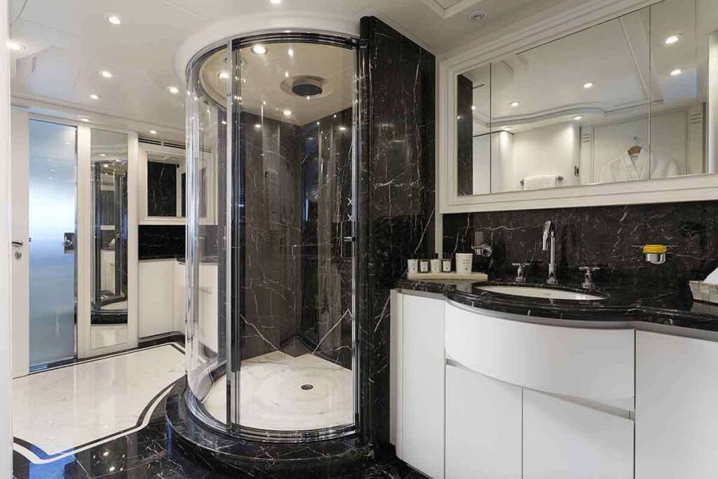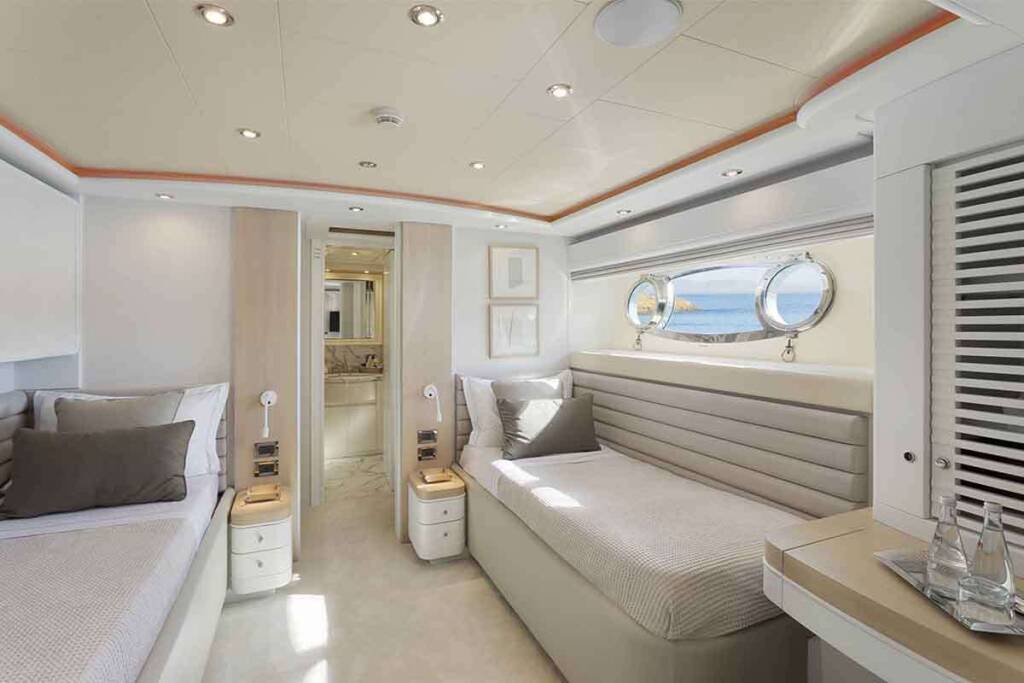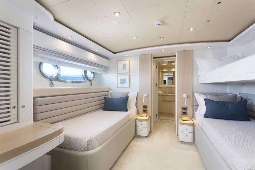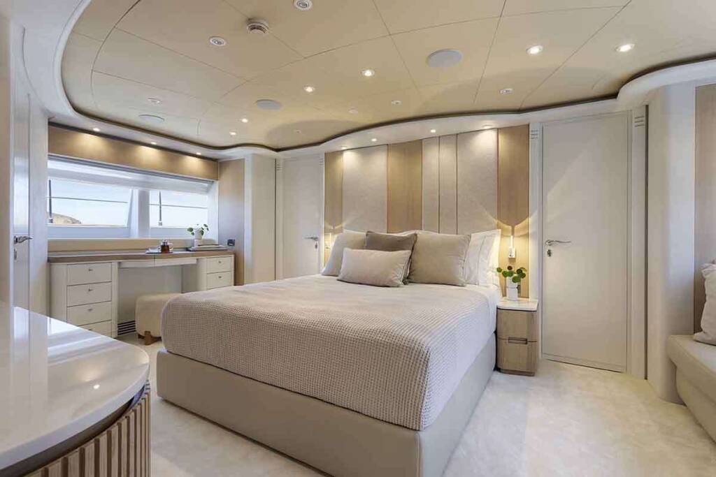 - 1 master cabin king size bed (1,80m x 2,05m) + TV + music + en-suite bathroom with his & hers sink + safe + walk in closets + office desk + A/C