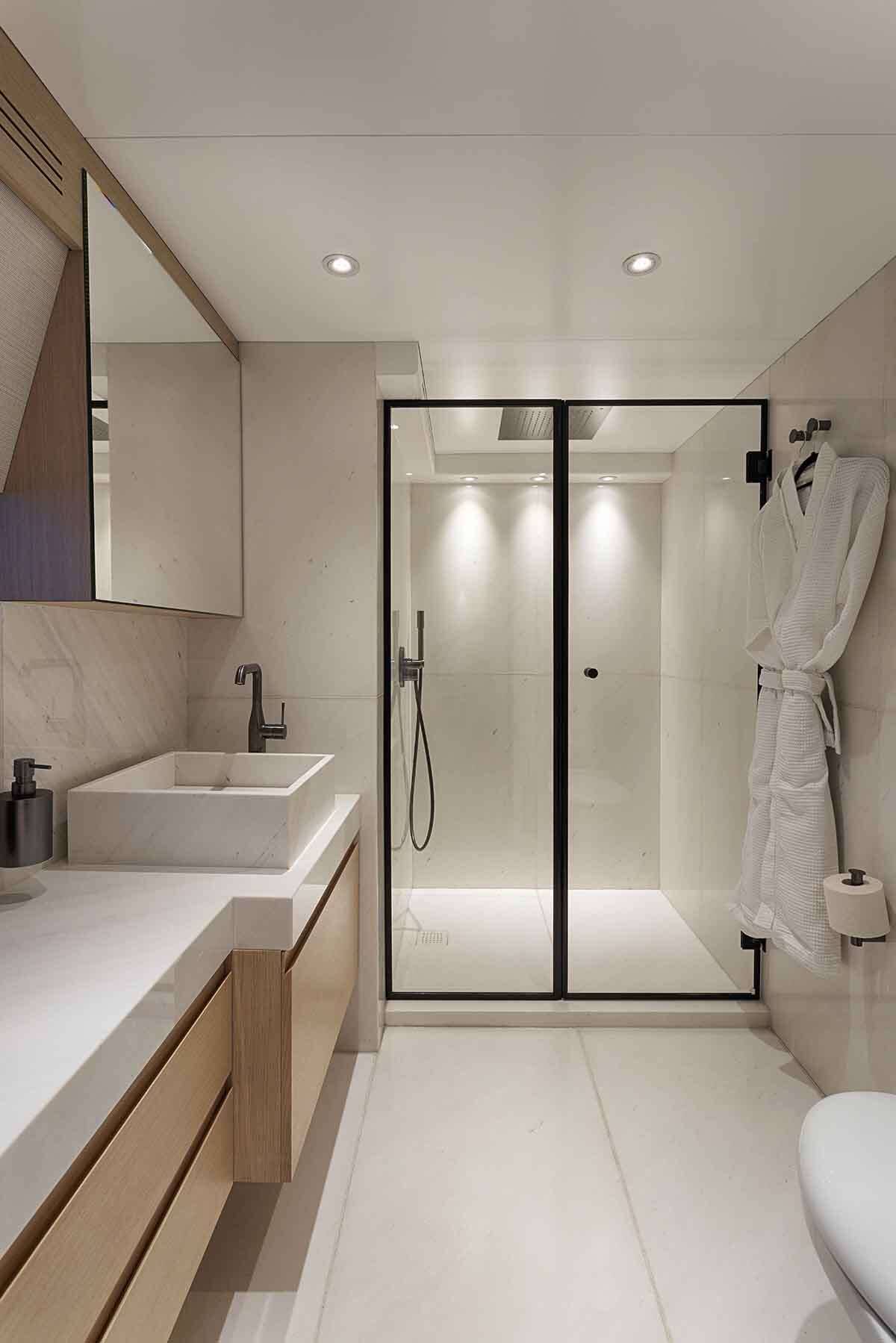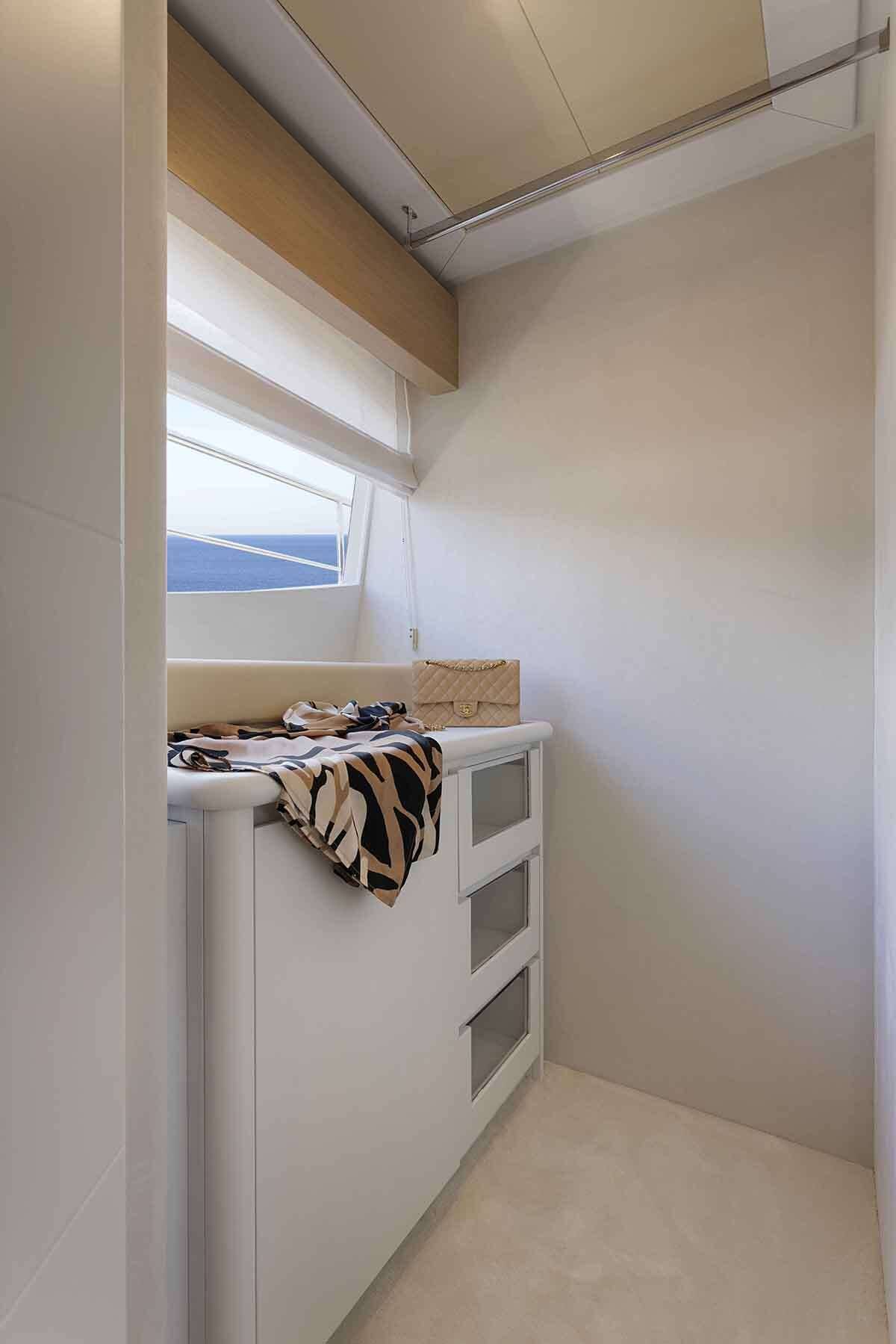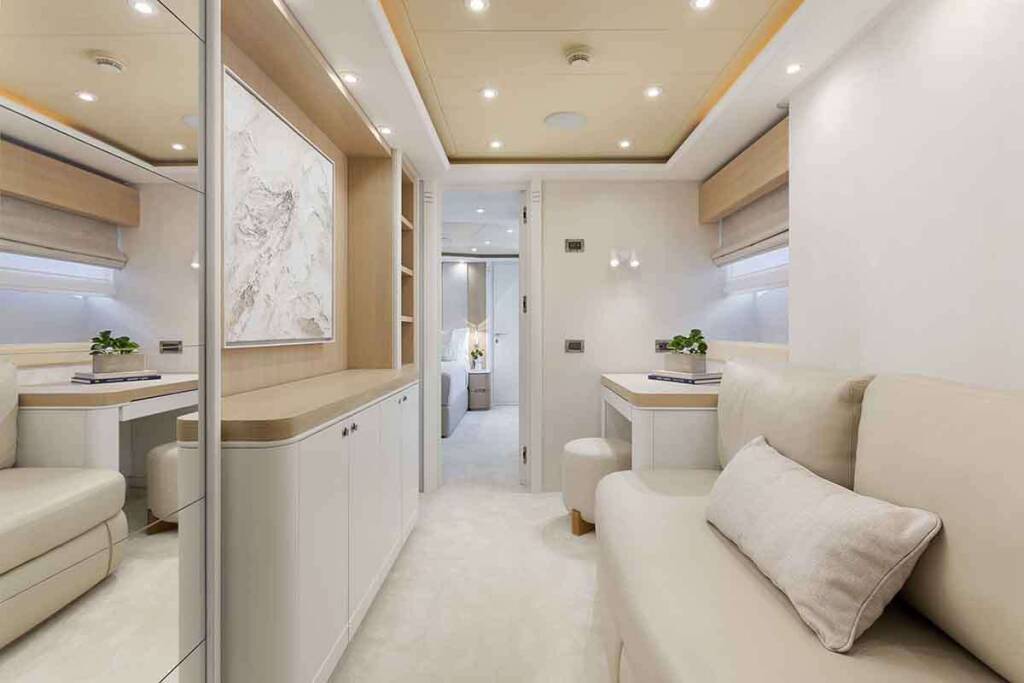 - 1 master cabin king size bed (1,80m x 2,05m) + TV + music + en-suite bathroom with his & hers sink + safe + walk in closets + office desk + A/C