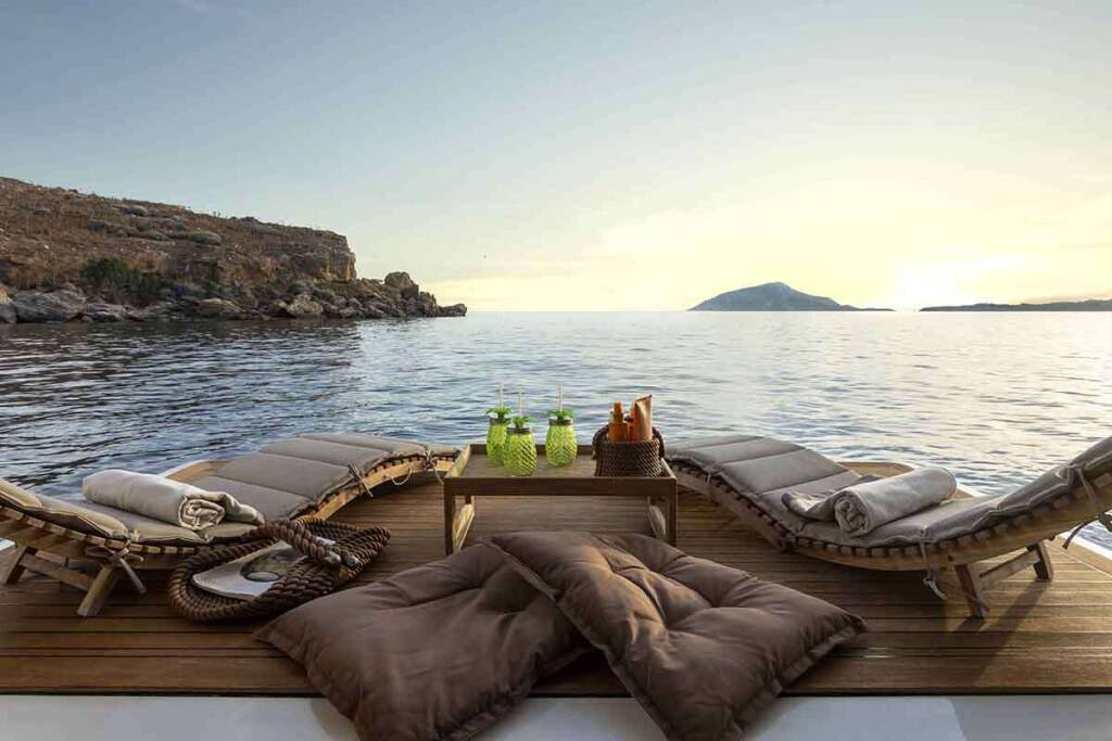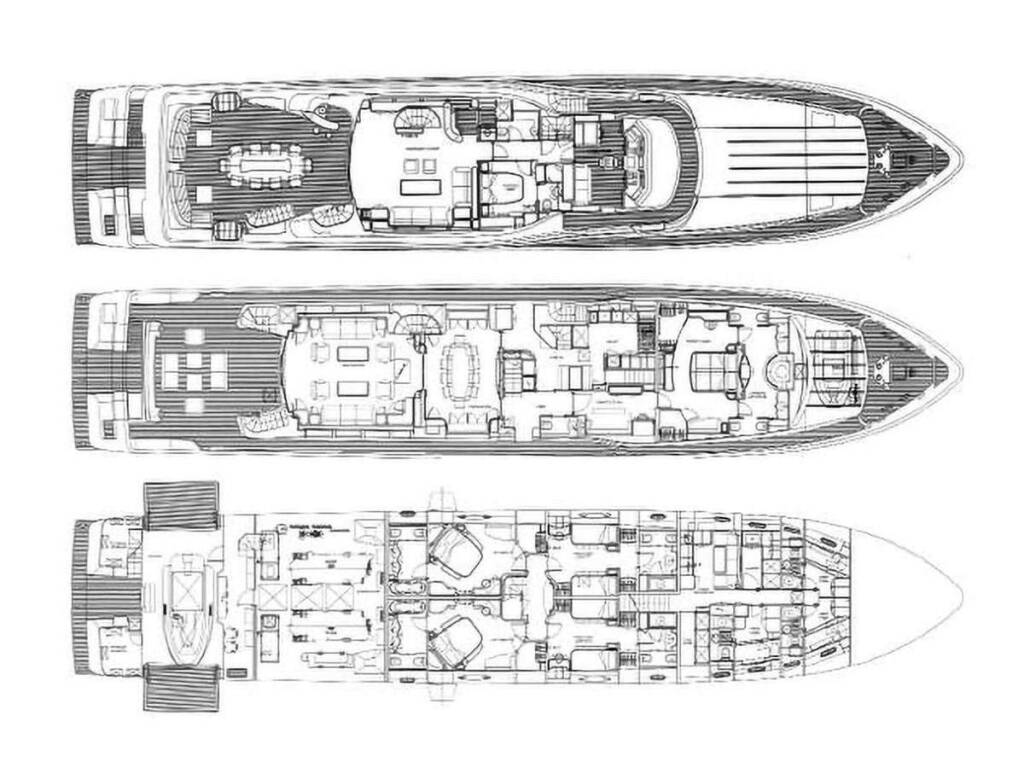 - 2 VIP cabins with queen beds (1,90m x 1,60m) + TV + music + en-suite bathrooms + closets + safe + desk + A/C