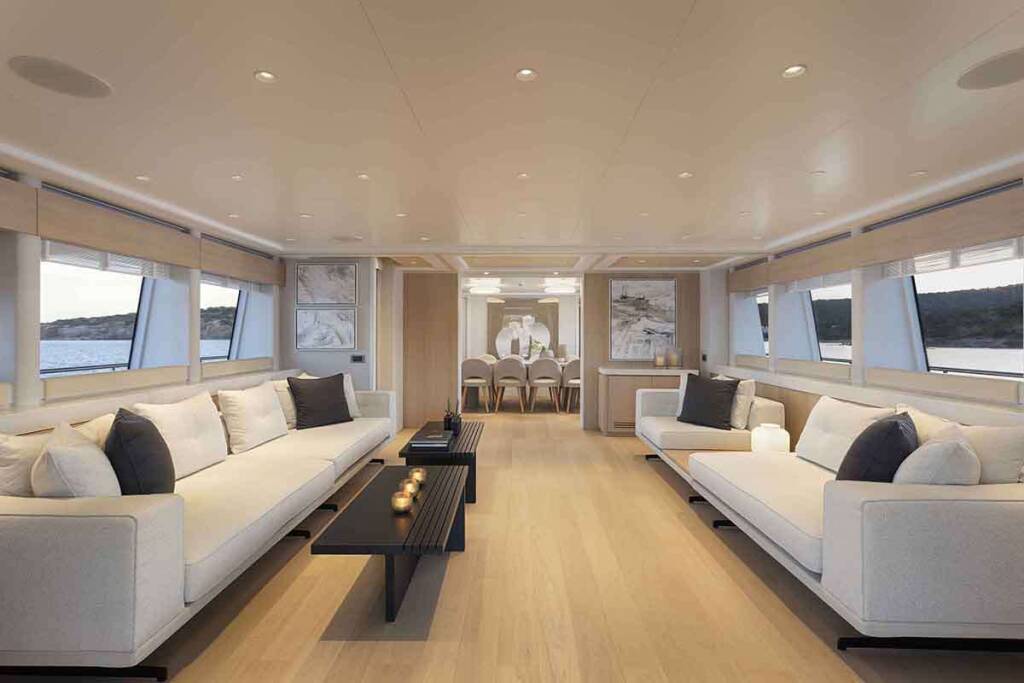 MAIN DECK SALOON - 1 x TV 46" Samsung Smart LED (pop-up) - (yr 2024) - Home Cinema Denon AVR 2600H DAB, - (yr 2024) - DVD Sony Blue Ray UBP-X800 M2 - (yr 2024) - Sound System with surround sound - (yr 2024)