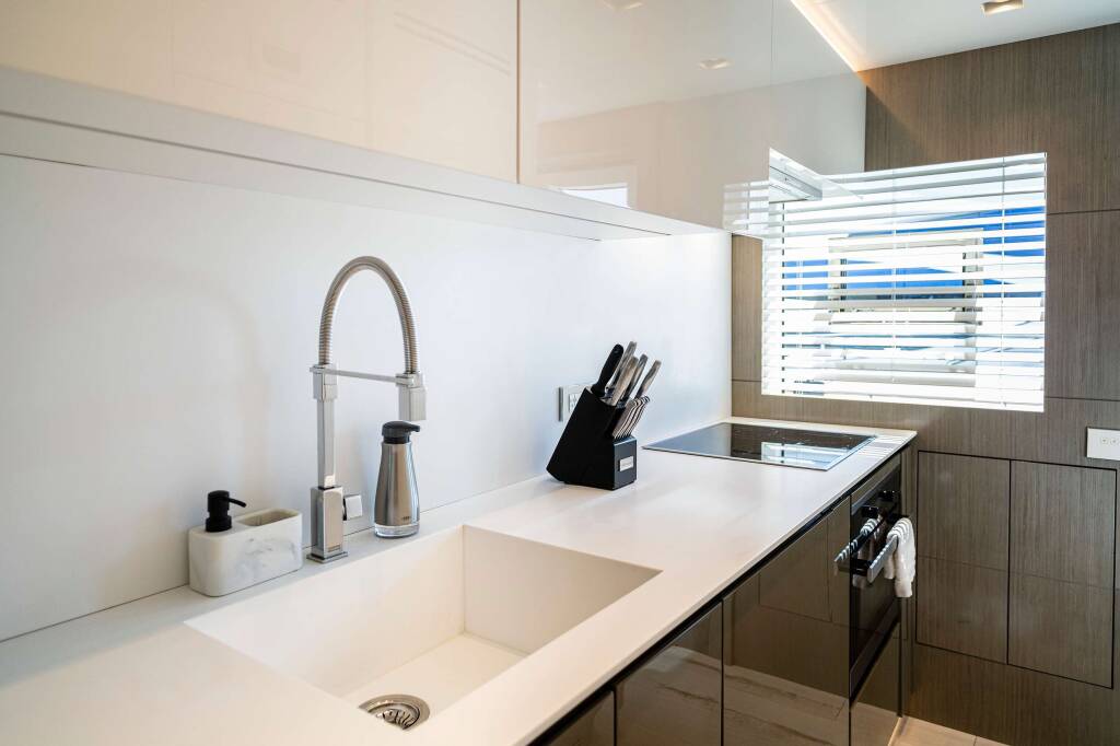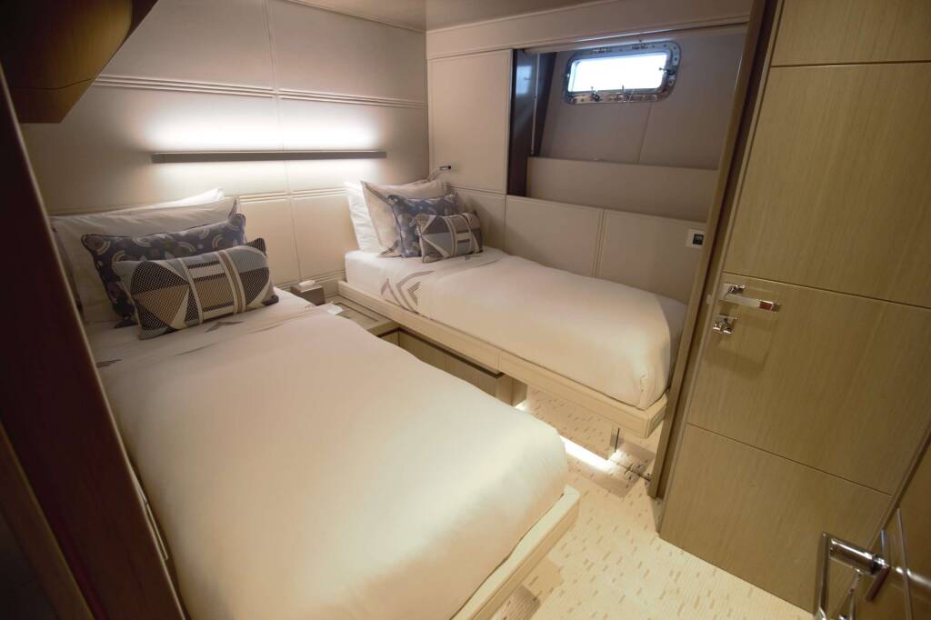 Accommodation: Master King on the main deck, VIP Queen below, plus one Full on Port side which can convert to twins, and then twin beds in the Starboard cabin.